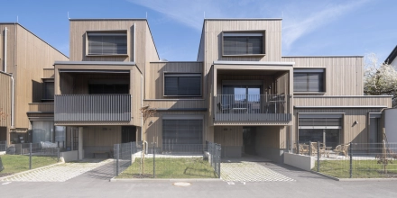 Die Häuser wurden in Mischbauweise aus Holz-Riegel-Wänden und Holzmassivwänden mit lasierter Fichtenholzverschalung errichtet, wobei neben konventionellen Dämmstoffen Holzwolledämmplatten verwendet wurden. Sämtliche Decken sind Holzmassivdecken, die im Innenbereich mit weißer Lasur eingelassen sind, Holztreppen und Eichenparkett runden die wohnliche Atmosphäre ab.