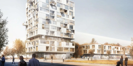 Bei diesem Projekt galt es ein neues Wohnquartier in Berlin Mitte zu planen, Ziel war es Diversität bei den Wohnungstypen und Räume für soziale Interaktionen zu schaffen. Gelöst wurde dies mit einem feingliedrig strukturierten Flachbaukörper, der am einen Ende an ein bestehendes Hochhaus anschließt und am anderen Ende durch ein neues Hochhaus seinen Abschluss findet. Oberhalb der niedrigen Bebauung springt das Hochhaus im 3. Obergeschoß zurück, erzeugt eine deutlich sichtbare Fuge im Baukörper und bindet somit die beiden Bauteile visuell aneinander. Durch das Zurückspringen der Sockelzone von Turm und Flachbau entsteht eine Art Loggia als lebendige, geschützte, öffentliche Zone, die zum Flanieren und Verweilen einlädt.
